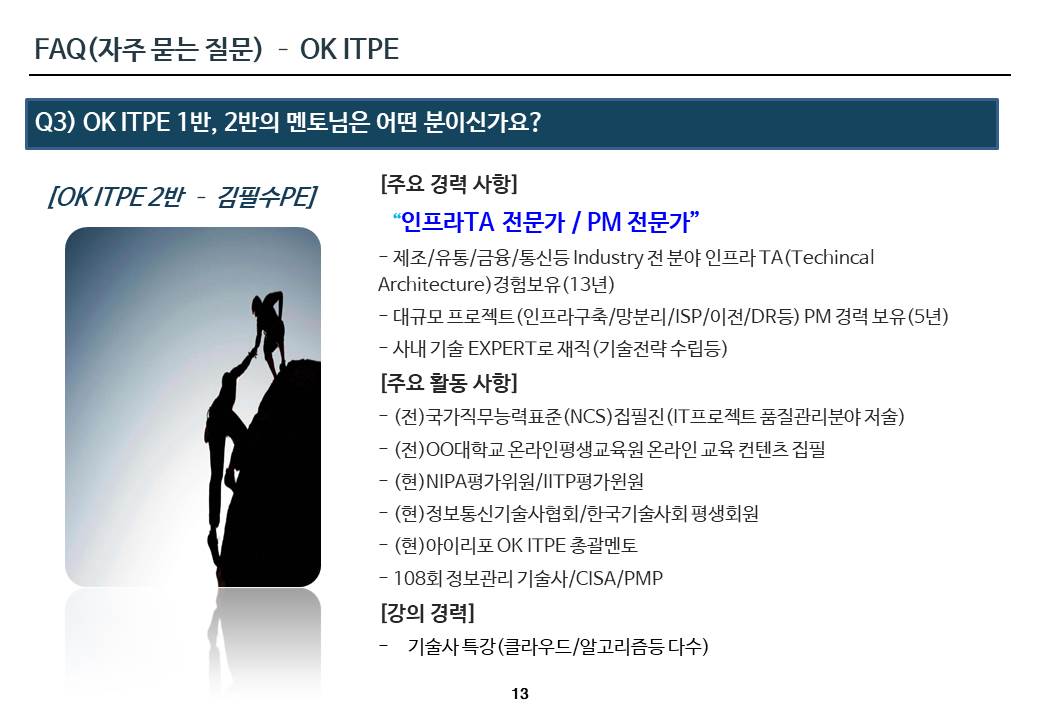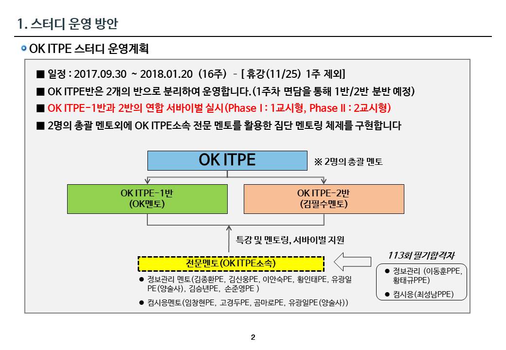 - 전문 멘토 : OK ITPE 기술사회 (110회 유광일PE 양술사, 108회 황인태PE(관리), 고경두PE, 곰마로PE(컴시응) 外