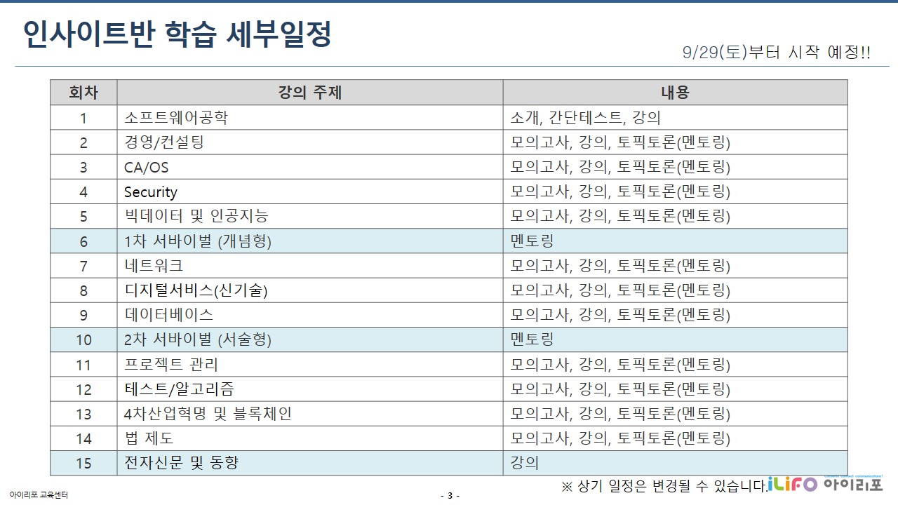 1. 교육일정: 2018.09.29 ~ 2018.12.30, 14회차/112시간(매주 토)+ 모의고사 2회